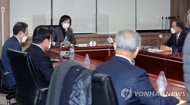 (서울=연합뉴스) 백승렬 기자 = 전현희 국민권익위원장이 11일 정부서울청사를 방문한 이성희 농협중앙회장·임준택 수협중앙회장 등 유관기관 대표들과 함께 설의 청탁금지법 선물가격 상향에 관해 논의하고 있다. 2021.1.11