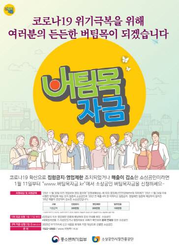 '소상공인 버팀목자금'은 11일부터 중소벤처기업부(소상공인시장진흥공단)가 개설한 온라인 사이트(www.버팀목자금.kr)에서 신청할 수 있다.