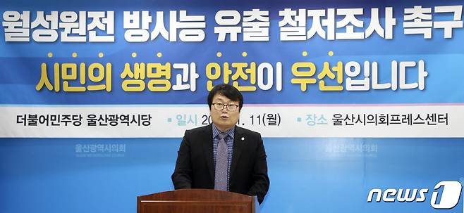 (울산=뉴스1) 윤일지 기자 = 최덕종 더불어민주당 울산시당 대변인이 11일 오전 울산시의회 프레스센터에서 경북 경주 월성원전 지하수에서 방사성 물질인 삼중수소가 검출된 것과 관련해 관계기관의 철저한 조사를 촉구하고 있다. 2021.1.11/뉴스1