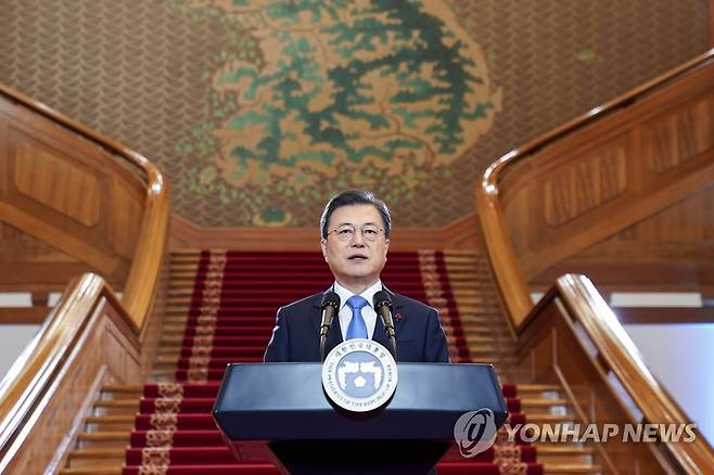 (서울=연합뉴스) 최재구 기자 = 문재인 대통령이 11일 청와대에서 신년사를 하고 있다. 2021.1.11