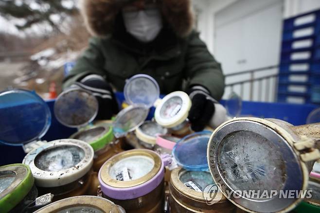 (서울=연합뉴스) 진연수 기자 = '북극발 한파'가 이어지는 11일 서울 서대문구 서부수도사업소에서 관계자가 동파된 수도계량기를 정리하고 있다. 중앙재난안전대책본부(중대본)에 따르면 지난 6일부터 이날 오전 6시까지 전국에서 수도계량기 7천207건, 수도관 314건 등 모두 7천521건의 동파피해가 발생했다. 2021.1.11