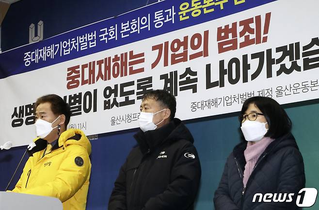 (울산=뉴스1) 윤일지 기자 = 중대재해기업처벌법 제정 울산운동본부 구성원들이 11일 오전 울산시청 프레스센터에서 중대재해기업처벌법 국회 본회의 통과와 관련해 입장을 밝히는 기자회견을 하고 있다. 이날 이들은 "제대로 된 중대재해기업처벌법이 되도록 개정 투쟁을 강력하게 전개할 것"이라고 밝혔다. 2021.1.11/뉴스1