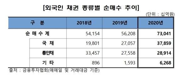 금투협 관계자는 "국가 신용등급 대비 높은 금리, 환율 하락 및 재정거래 유인 지속 등으로 외국인의 국내채권 보유잔고가 증가했다"며 "외국인은 국채를 37조9000억원, 통안채는 28조9000억원 등 총 73조원 순매수했다"고 설명했다.
