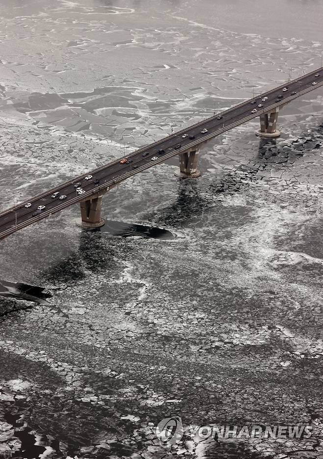 (서울=연합뉴스) 한종찬 기자 = '북극 한파'가 계속된 11일 서울 여의도 63스퀘어에서 바라본 한강이 얼어 있다. 2021.1.11