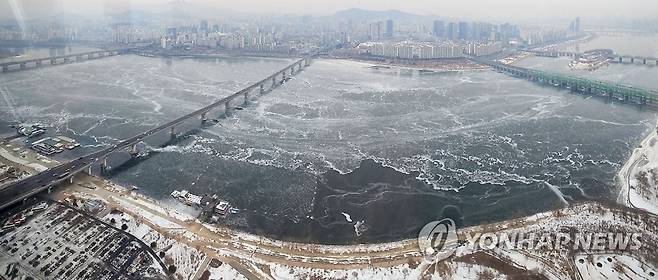 (서울=연합뉴스) 한종찬 기자 = '북극 한파'가 계속된 11일 서울 여의도 63스퀘어에서 바라본 한강이 얼어 있다. 2021.1.11