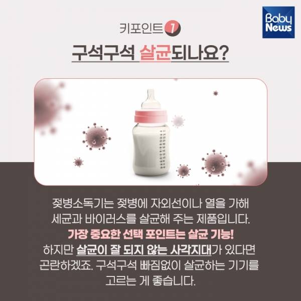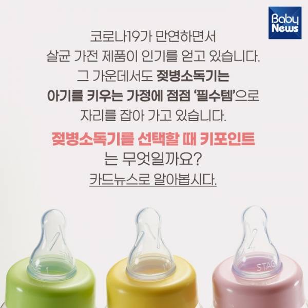 2. 코로나19가 만연하면서 살균 가전 제품이 인기를 얻고 있습니다. 그 가운데서도 젖병소독기는 아기를 키우는 가정에 점점 '필수템'으로 자리를 잡아 가고 있습니다. 젖병소독기를 선택할 때 키포인트는 무엇일까요? 카드뉴스로 알아봅시다.