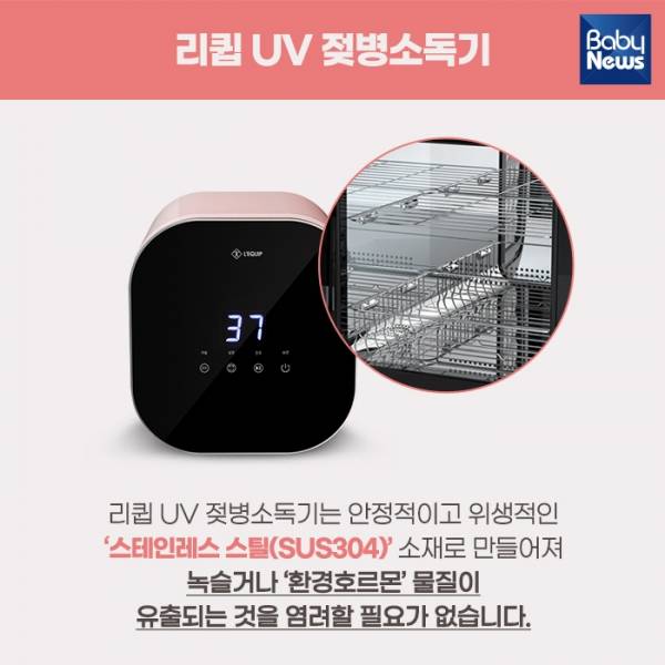 리큅 UV 젖병소독기는 안정적이고 위생적인 '스테인레스 스틸(SUS304)' 소재로 만들어져 녹슬거나 '환경호르몬' 물질이 유출되는 것을 염려할 필요가 없습니다.
