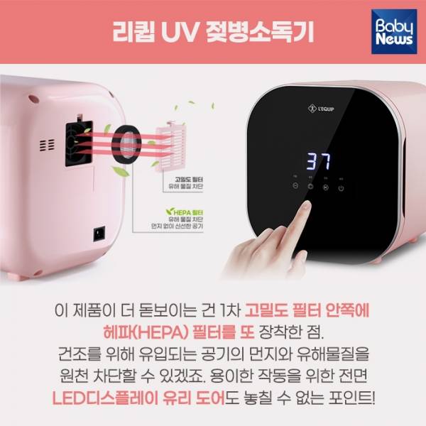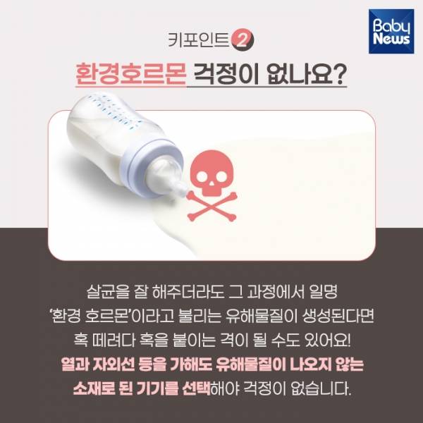 살균을 잘 해주더라도 그 과정에서 일명 '환경 호르몬'이라고 불리는 유해물질이 생성된다면 혹 떼려다 혹을 붙이는 격이 될 수도 있어요! 열과 자외선 등을 가해도 유해물질이 나오지 않는 소재로 된 기기를 선택해야 걱정이 없습니다.