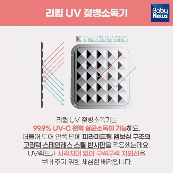 리큅 UV 젖병소독기는 99.9% UV-C 완벽 살균소독이 가능해요. 더불어 도어 안쪽 면에 피라미드형 엠보싱 구조의 고광택 스테인레스 스틸 반사판을 적용했어요. UV램프가 사각지대 없이 구석구석 자외선을 보내 주기 위한 세심한 배려입니다.