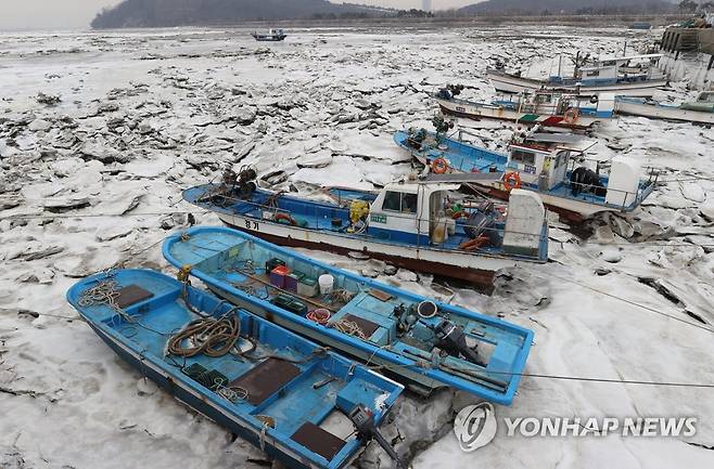 (영종도=연합뉴스) 서명곤 기자 = 강추위가 계속된 11일 인천 중구 예단포 선착장 갯벌이 얼어있다. 2021.1.11