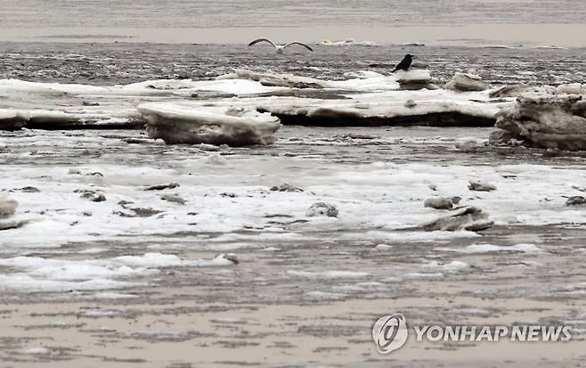 (영종도=연합뉴스) 서명곤 기자 = 강추위가 계속된 11일 인천 중구 예단포 선착장 갯벌이 얼어있다. 2021.1.11