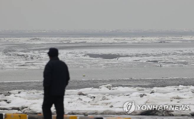 (영종도=연합뉴스) 서명곤 기자 = 강추위가 계속된 11일 인천 중구 예단포 선착장 갯벌이 얼어있다. 2021.1.11