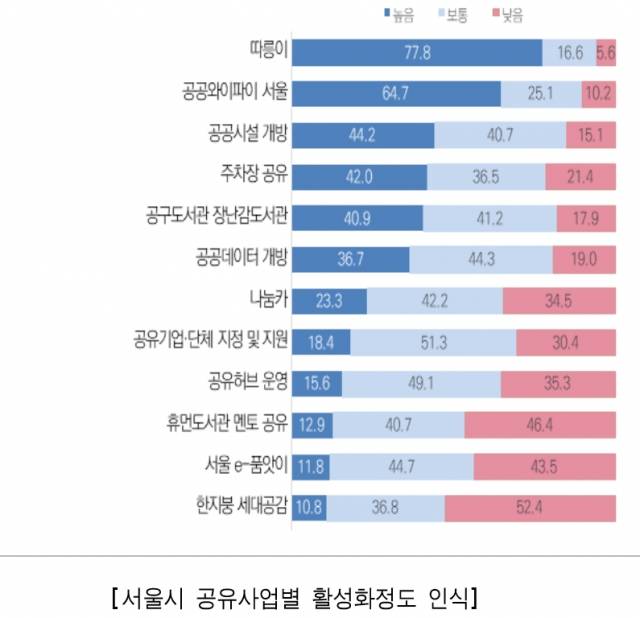 시민들이 인식하는 활성화된 서울시 공유사업은 따릉이(77.8%), 공공와이파이 서울(64.7%), 공공시설 개방(44.2%), 주차장 공유(42.0%) 순이었다. 서울시 공유정책이 어떤 사회·도시문제 해결에 기여하는지에 대해서는 ‘도시 수요에 대응하는 새로운 서비스 창출’이라는 응답이 66.1%로 가장 높게 나타났다. 현재 서울시는 공유정책을 통해 정보·통신, 이동 주차, 물품공간, 재능 등 시민이 필요로 하는 다양한 영역에 공유서비스를 발굴·시행중이다.