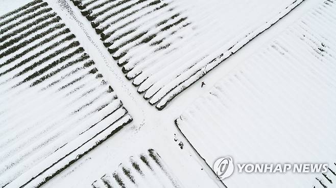 (서귀포=연합뉴스) 박지호 기자 = 11일 오후 제주 서귀포시 도순동 돌송이차밭에 눈이 내려 이국적인 풍경을 연출하고 있다. 2021.1.11