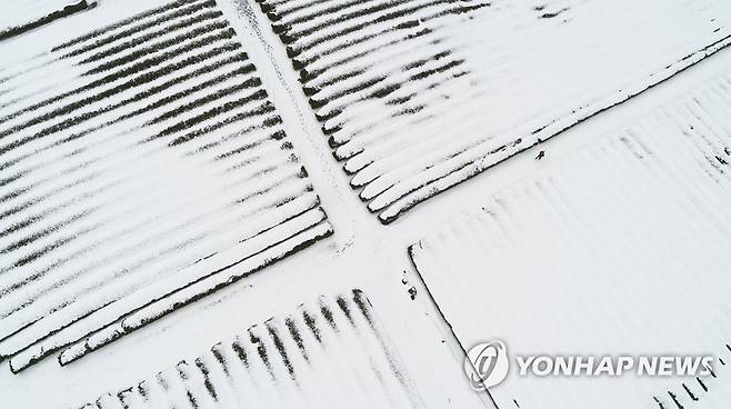 (서귀포=연합뉴스) 박지호 기자 = 11일 오후 제주 서귀포시 도순동 돌송이차밭에 눈이 내려 이국적인 풍경을 연출하고 있다. 2021.1.11