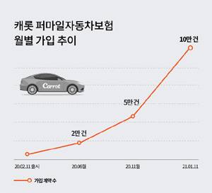 국내 1호 디지털 손해보험사 캐롯손해보험은 주력상품인 '퍼마일자동차보험' 신규 가입 계약 수가 출시 11개월만에 10만건을 돌파했다고 밝혔다. 이 상품은 매월 기본료에 주행거리에 따라 후불로 내는 신개념 자동차보험이다. 퍼마일자동차보험은 출시 후 가입 계약 수가 증가해오다 지난해 10월 배우 신민아와 함께하는 신규 광고 효과가 더해지며 출시 8개월여만인 11월초 5만건을 돌파했다. 이후 가파른 상승세를 이어가며 5만건 돌파 2개월 여만에 10만건을 기록했다.