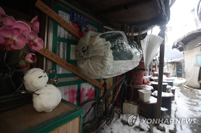 (서울=연합뉴스) 임헌정 기자 = 연일 한파가 계속되는 가운데 11일 서울 강남구 개포동 구룡마을에서 누군가가 만들어놓은 눈사람이 보이고 있다. 2021.1.11