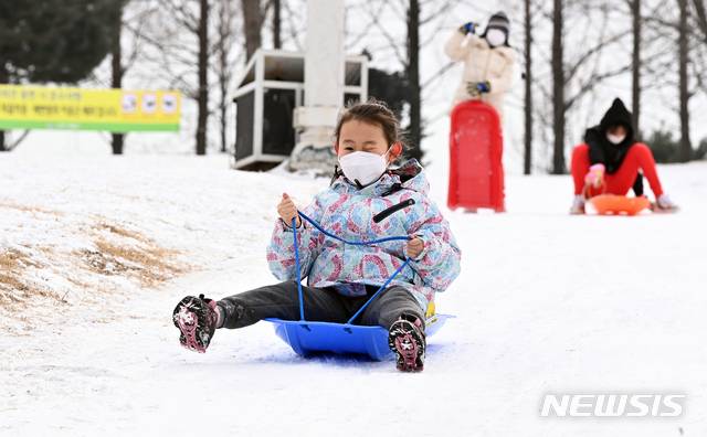 [수원=뉴시스] 김종택기자 = 11일 오후 경기도 수원시 팔달구 수원야외음악당에서 어린이들이 눈썰매를 타며 즐거운 시간을 보내고 있다. 2021.01.11.