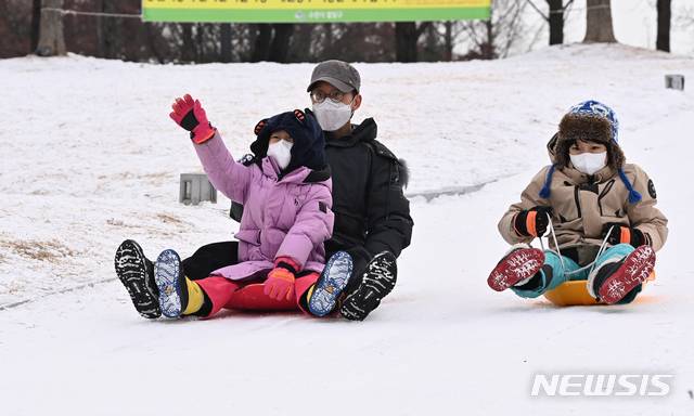 [수원=뉴시스] 김종택기자 = 11일 오후 경기도 수원시 팔달구 수원야외음악당에서 어린이들이 눈썰매를 타며 즐거운 시간을 보내고 있다. 2021.01.11.