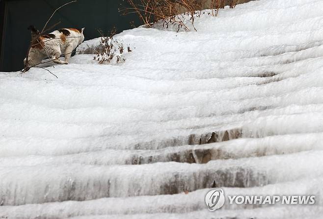 (서울=연합뉴스) 신준희 기자 = 11일 북극 한파로 인한 수도 동파로 얼어버린 종로구의 한 주택가 계단을 고양이가 조심스럽게 오르고 있다. 2021.1.11