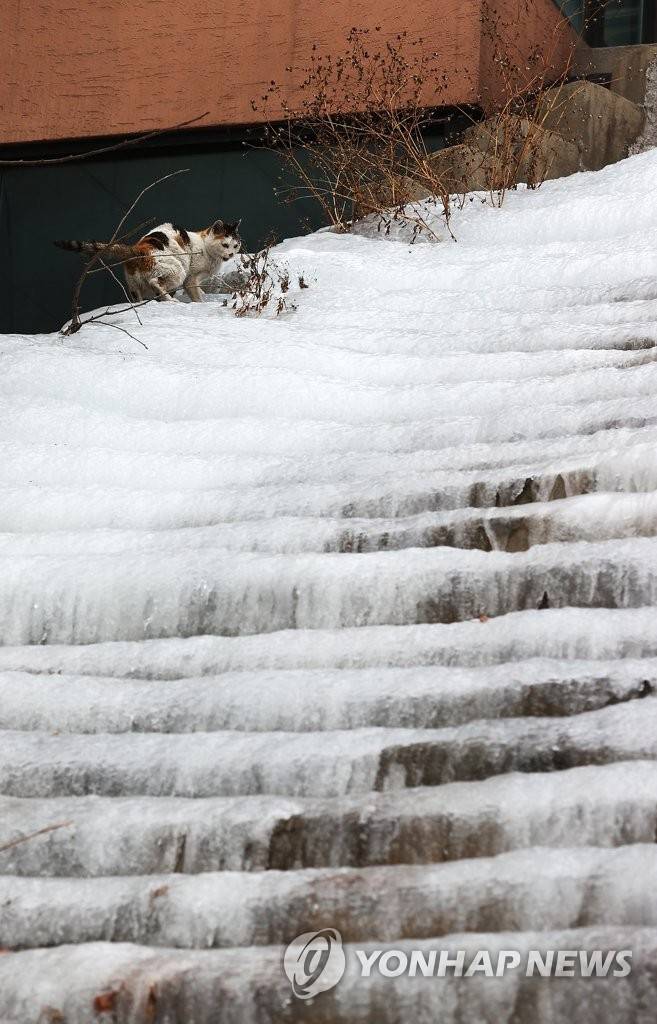 (서울=연합뉴스) 신준희 기자 = 11일 북극 한파로 인한 수도 동파로 얼어버린 종로구의 한 주택가 계단을 고양이가 조심스럽게 오르고 있다. 2021.1.11