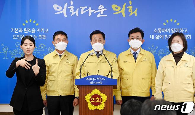 (수원=뉴스1) 경기사진공동취재단 = 장현국 경기도의회 의장을 비롯한 도의회 의장단과 박근철 경기도의회 더불어민주당 대표의원이 11일 오후 경기도 수원시 팔달구 경기도의회 브리핑룸에서 제2차 경기도 재난기본소득 지급을 집행부에 공식 제안하는 기자회견을 하고 있다. 2021.1.11/뉴스1