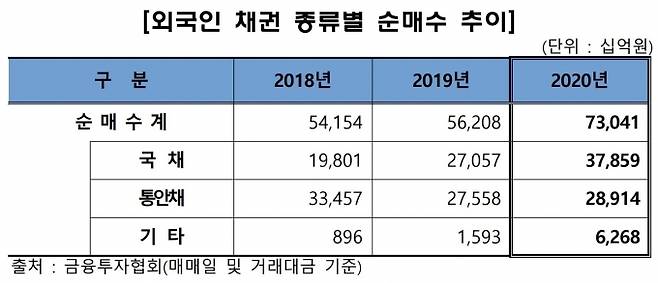 금투협 관계자는 "국가 신용등급 대비 높은 금리, 환율 하락, 재정거래 유인 지속 등으로 외국인의 국내채권 보유잔고가 증가했다"며 "외국인은 국채 37조9천억원, 통안채 28조9천억원 등 총 73조원을 순매수했다"고 설명했다.