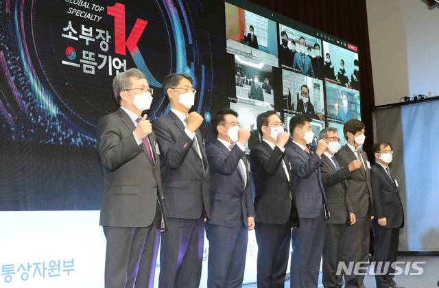 [세종=뉴시스]강종민 기자 = 성윤모 산업통상자원부 장관이 11일 오후 정부세종컨벤션센터에서 열린 소부장 으뜸기업 비전 선포식에서 선정된 으뜸기업 대표들과 파이팅을 외치고 있다. 이날 선포식에서는 핵심전략기술에 특화된 국내 22개 기업이 선정됐다. 2021.01.11.
