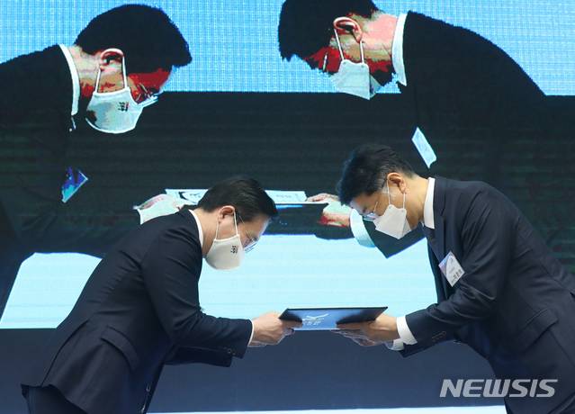 [세종=뉴시스]강종민 기자 = 성윤모 산업통상자원부 장관이 11일 오후 정부세종컨벤션센터에서 열린 소부장 으뜸기업 비전 선포식에서 이준혁 동진쎄미켐 대표이사에게 지정서를 수여하고 있다. 이날 선포식에서는 핵심전략기술에 특화된 국내 22개 기업이 선정됐다. 2021.01.11.