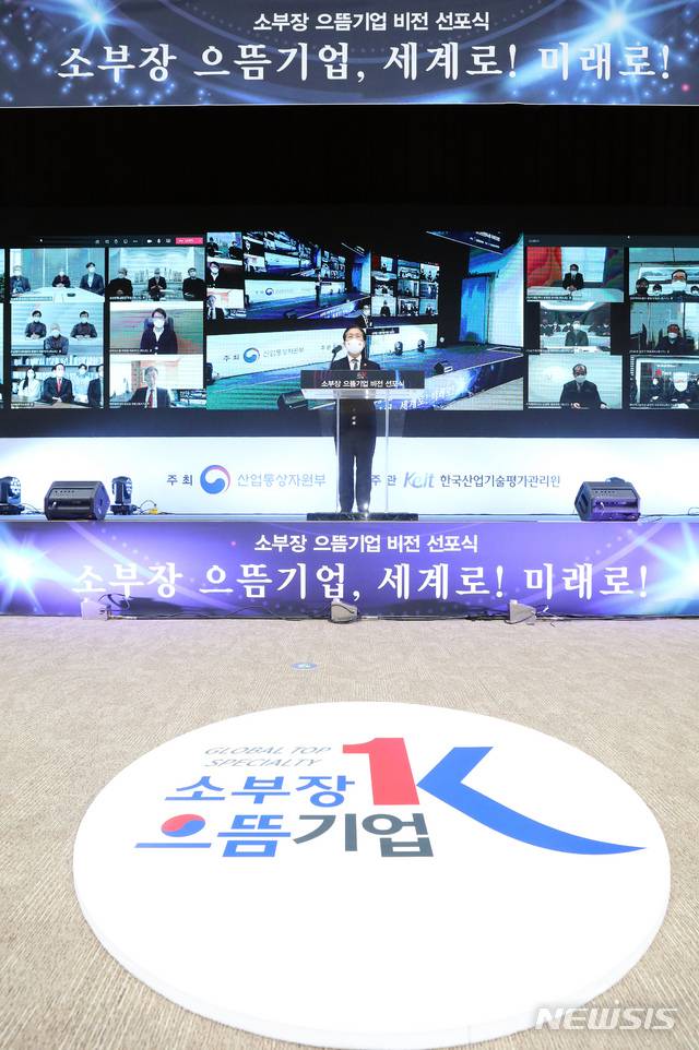 [세종=뉴시스]강종민 기자 = 성윤모 산업통상자원부 장관이 11일 오후 정부세종컨벤션센터에서 열린 소부장 으뜸기업 비전 선포식에서 축사를 하고 있다. 이날 선포식에서는 핵심전략기술에 특화된 국내 22개 기업이 선정됐다. 2021.01.11.