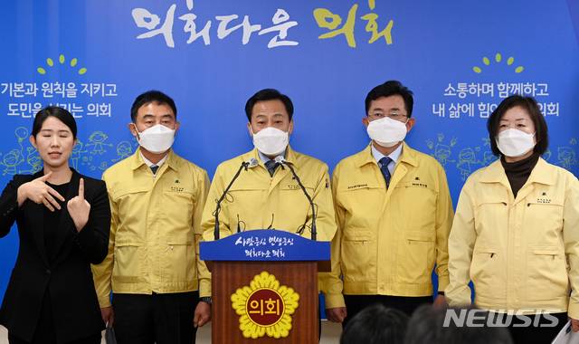 [수원=뉴시스] 경기사진공동취재단 = 장현국 경기도의회 의장, 박근철 경기도의회 더불어민주당 대표 등이 11일 오후 경기도 수원시 팔달구 경기도의회 브리핑룸에서 '제2차 경기도 재난기본소득 지급을 집행부에 공식 제안하는 기자회견을 하고 있다. 2021.01.11.