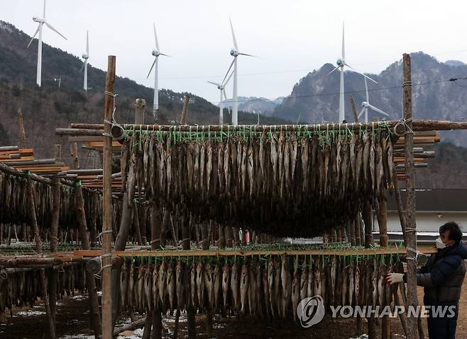 (인제=연합뉴스) 이재현 기자 = 강추위가 몰아친 11일 오후 강원 인제군 북면 용대리 덕장에 내걸린 인제 황태가 풍력발전시설이 자리한 용바위와 매바위 협곡의 골바람을 견디며 노르스름한 황금빛 황태로 익어가고 있다. 2021.1.11