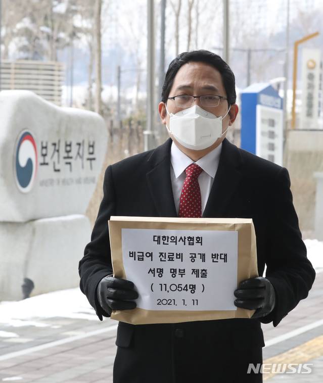 [세종=뉴시스]강종민 기자 = 최대집 대한의사협회 회장이 11일 오후 '비급여 진료비 공개 반대 서명 명부'를 제출하기 위해 정부세종청사 보건복지부에 들어서고 있다. (공동취재사진) 2021.01.11.