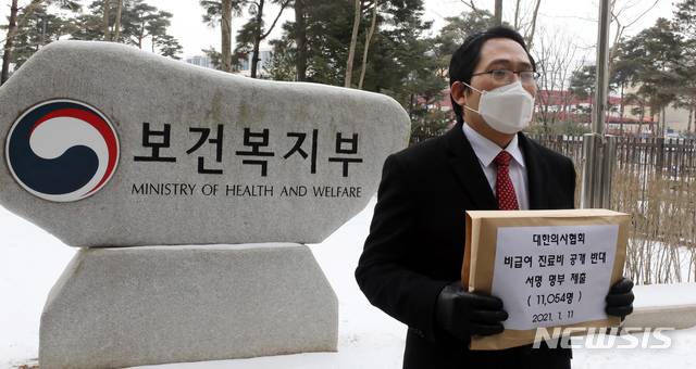 [세종=뉴시스]강종민 기자 = 최대집 대한의사협회 회장이 11일 오후 '비급여 진료비 공개 반대 서명 명부'를 제출하기 위해 정부세종청사 보건복지부에 들어서고 있다. (공동취재사진) 2021.01.11.