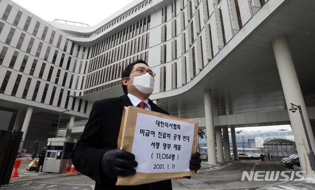 [세종=뉴시스]강종민 기자 = 최대집 대한의사협회 회장이 11일 오후 '비급여 진료비 공개 반대 서명 명부'를 제출하기 위해 정부세종청사 보건복지부에 들어서고 있다. (공동취재사진) 2021.01.11.