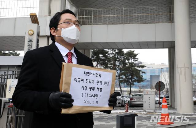 [세종=뉴시스]강종민 기자 = 최대집 대한의사협회 회장이 11일 오후 '비급여 진료비 공개 반대 서명 명부'를 제출하기 위해 정부세종청사 보건복지부에 들어서고 있다. (공동취재사진) 2021.01.11.
