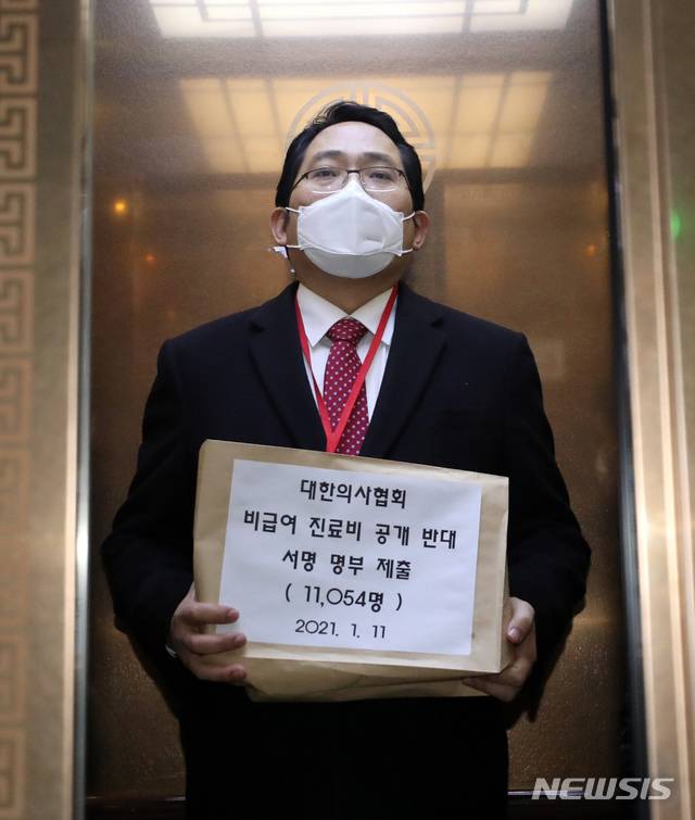 [세종=뉴시스]강종민 기자 = 최대집 대한의사협회 회장이 11일 오후 '비급여 진료비 공개 반대 서명 명부'를 제출하기 위해 정부세종청사 보건복지부에 들어서고 있다. (공동취재사진) 2021.01.11.
