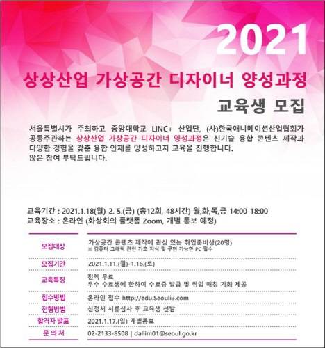 서울시는 게임, 애니메이션, 특수효과 등 컴퓨터 그래픽 관련 분야에 신기술 융합 콘텐츠 제작을 위한 전문가, 가상공간 디자이너(Virtual Habitat Designer) 양성 교육을 시작한다고 밝혔다.