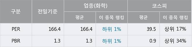 전일 종가를 기준으로 이 종목의 PER는 166.4배, PBR은 1.3배이다. PER는 화학업종의 평균 PER 166.4배와 동일한 수준으로 업종 내에서 하위 1%에 있고, PBR은 화학업종의 평균 PBR 1.3배와 동일한 수준으로 업종 내에서 하위 1%에 위치한다. 보통 낮은 PER는 현재 시장이 해당 기업의 가치를 상대적으로 낮게 평가하고 있다고 해석될 수 있다.