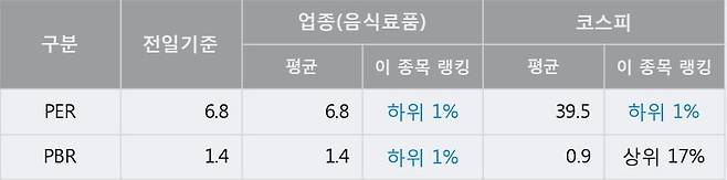 전일 종가를 기준으로 이 종목의 PER는 6.8배, PBR은 1.4배이다. PER는 음식료품업종의 평균 PER 6.8배와 동일한 수준으로 업종 내에서 하위 1%에 있고, PBR은 음식료품업종의 평균 PBR 1.4배와 동일한 수준으로 업종 내에서 하위 1%에 위치한다. 보통 낮은 PER는 현재 시장이 해당 기업의 가치를 상대적으로 낮게 평가하고 있다고 해석될 수 있다.