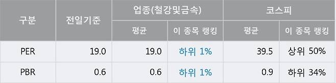 전일 종가를 기준으로 이 종목의 PER는 19.0배, PBR은 0.6배이다. PER는 철강및금속업종의 평균 PER 19.0배와 동일한 수준으로 업종 내에서 하위 1%에 있고, PBR은 철강및금속업종의 평균 PBR 0.6배와 동일한 수준으로 업종 내에서 하위 1%에 위치한다. 보통 낮은 PER는 현재 시장이 해당 기업의 가치를 상대적으로 낮게 평가하고 있다고 해석될 수 있다.