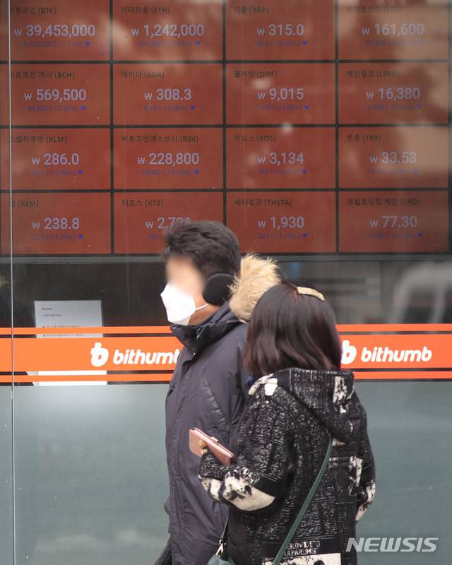 [서울=뉴시스] 박민석 기자 = 비트코인 시세가 개당 4000만원 밑으로 떨어진 11일 오후 서울 강남구 빗썸 강남고객상담센터에 암호화폐 시세 현황이 표시되고 있다. 2021.01.11. mspark@newsis.com