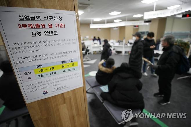 (서울=연합뉴스) 박동주 기자 = 11일 오후 고용노동부 서울남부고용센터에 실업급여 신규신청 2부제 시행 안내문이 붙어 있다.