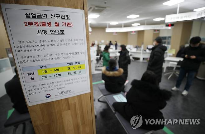 (서울=연합뉴스) 박동주 기자 = 11일 오후 고용노동부 서울남부고용센터에 실업급여 신규신청 2부제 시행 안내문이 붙어 있다.