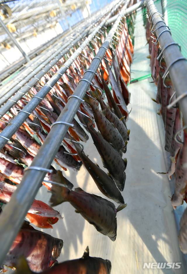 [화천=뉴시스]장경일 기자 = 11일 강원 화천군 상서면 신풍리 비닐하우스에서 반건조 상품으로 판매될 산천어를 건조하는 작업이 진행되고 있다. (사진=화천군청 제공) 2021.01.11. photo@newsis.com