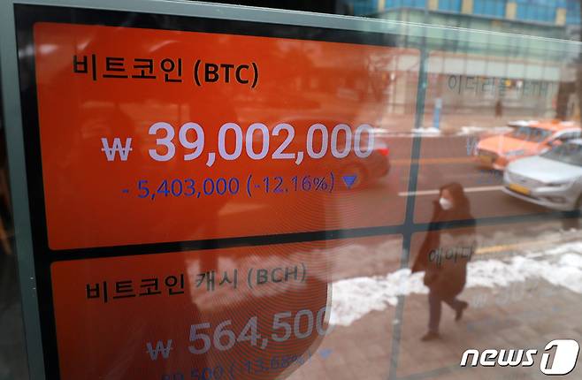 (서울=뉴스1) 구윤성 기자 = 11일 오후 서울 강남구 가상화폐 거래소 빗썸에 설치된 시세정보판에 비트코인 가격이 하루 전보다 10% 이상 하락한 3900만원대를 기록하고 있다. 2021.1.11/뉴스1