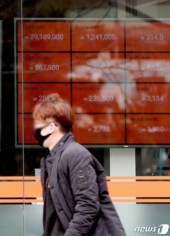 (서울=뉴스1) 구윤성 기자 = 11일 오후 서울 강남구 가상화폐 거래소 빗썸에 설치된 시세정보판에 비트코인 가격이 하루 전보다 10% 이상 하락한 3900만원대를 기록하고 있다. 2021.1.11/뉴스1
