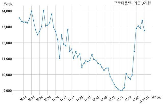 한편, 프로테옴텍은 장 마감 이후 해당 기업공시를 발표했으며 오늘 종가가 12,750원, 거래량은 7,937주로, 직전 거래일 대비 650원(-4.85%) 하락했다.