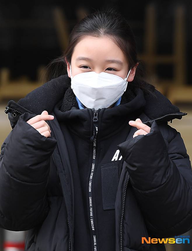 아역배우 김하연이 1월 11일 오후 방송 녹화 일정을 위해 서울 영등포구 KBS 별관으로 향하며 포즈를 취하고 있다