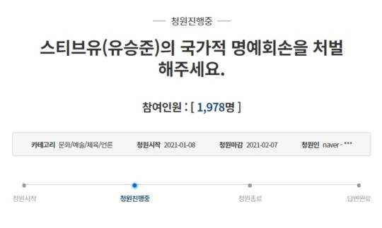 청와대 국민청원 게시판에는 지난 8일 '스티브유(유승준)의 국가적 명예 훼손을 처벌해주세요'라는 제목의 청원글이 올라왔다. 현재 글은 11일 현재 1,987명의 동의를 얻었다.